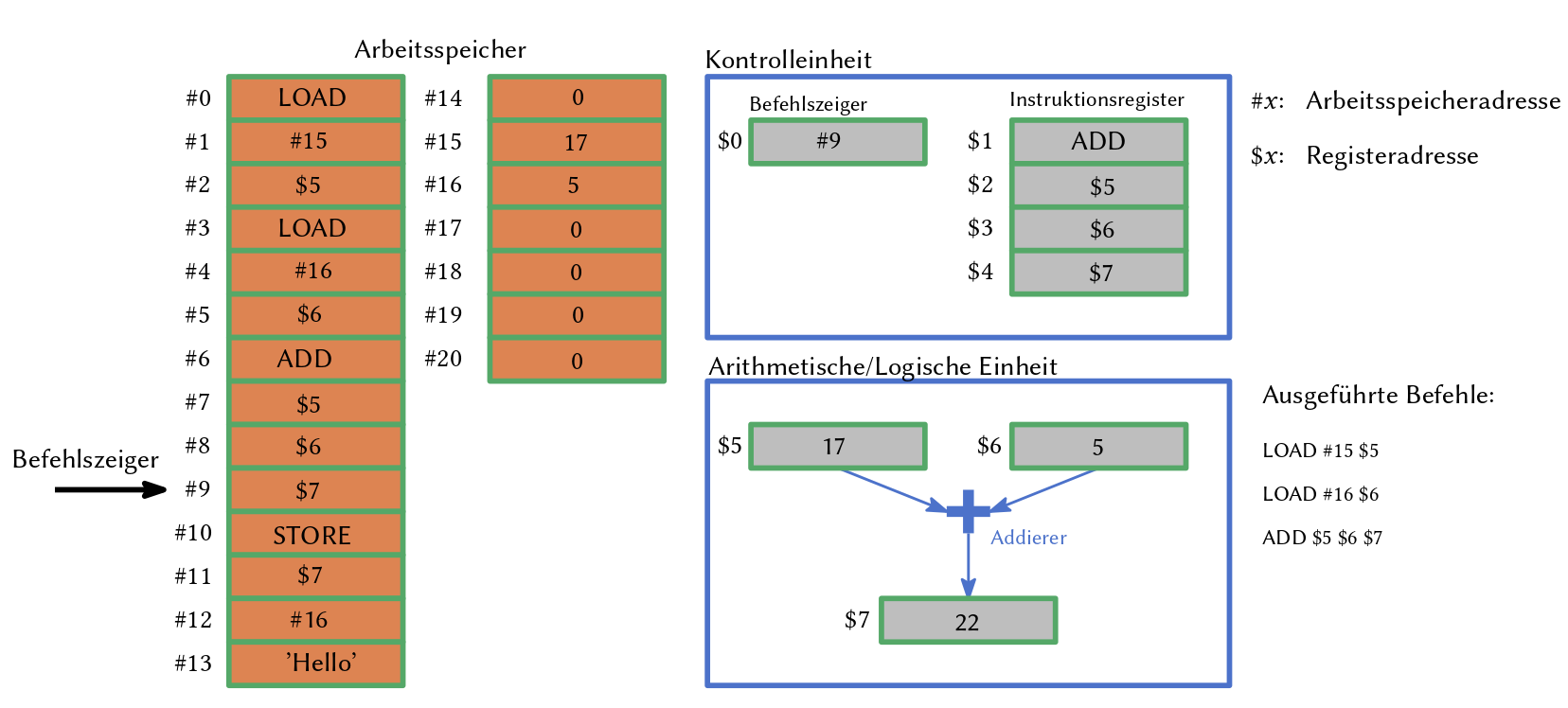 \(\text{LOAD} \ \#15 \ \$5\): Lade Daten aus Hauptspeicheradresse \(\#15\) ins Register \(\$5\)