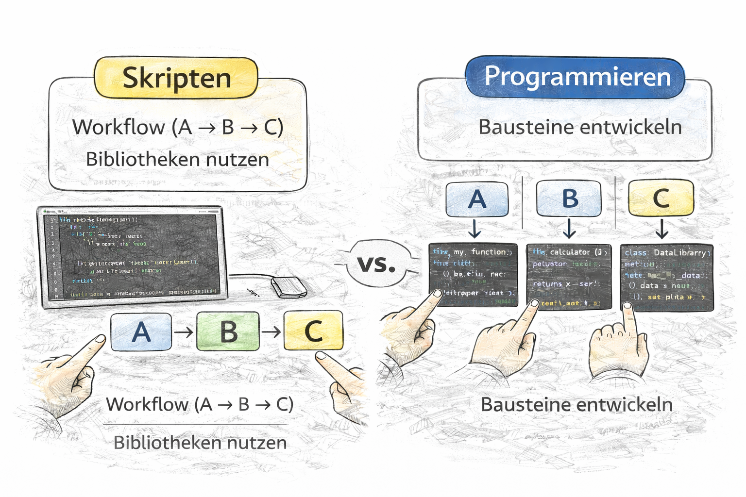 Beim Skripten beschreiben wir oft vor allem den Workflow (A → B → C) und nutzen vorhandene Bibliotheken als Bausteine.