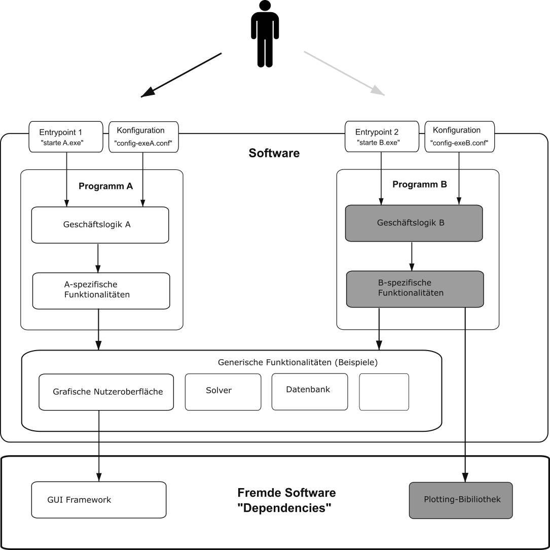Abb. 2.12 Anwendungs-Software besteht meist aus mehreren Programmen, die sowohl programmspezifischen Code enthalten als auch gemeinsamen Code nutzen. Häufig greifen Programme dabei auf extern entwickelte Bibliotheken oder Frameworks zurück.#