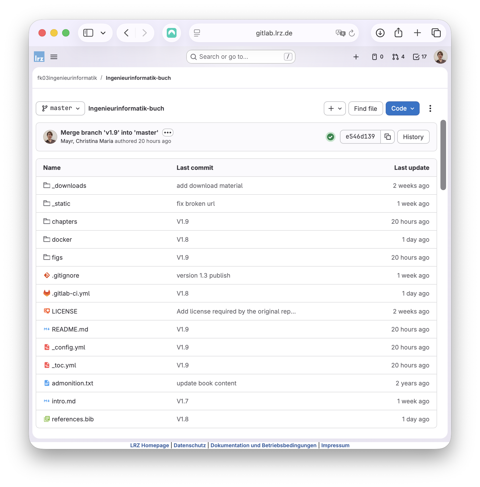 Abb. 2.14 Snapshot des Repositories auf GitLab LRZ, das den Quellcode des interaktiven Lehrbuchs enthält.#