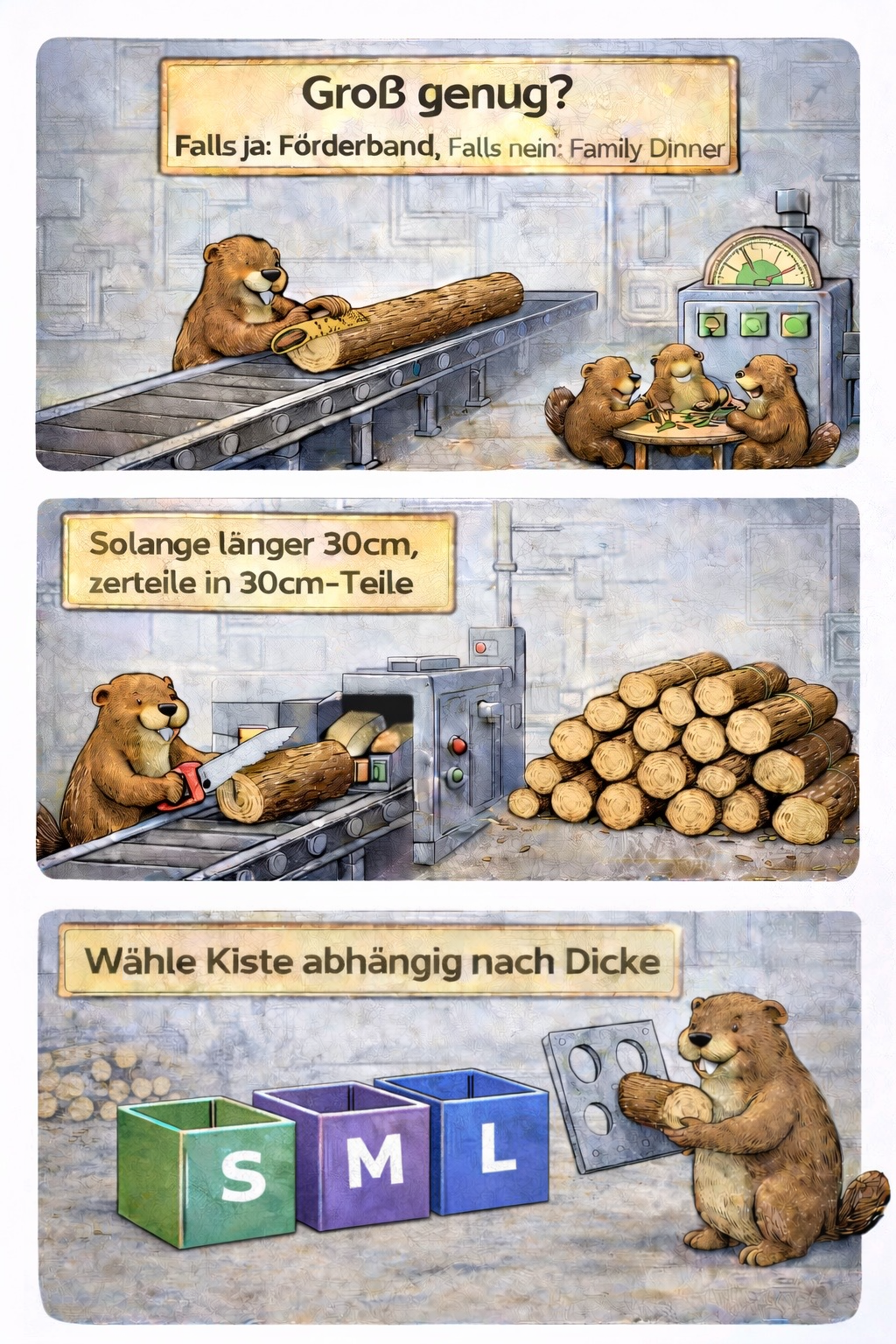 Schreiben Sie ein kleines Python-Programm, das Teilstücke eines Stamms in die Kisten S, M oder L einsortiert.