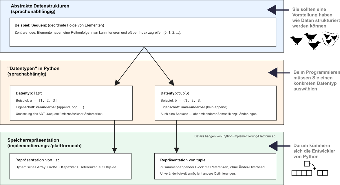 Datentypen (z. B. list, tuple) sind sprachabhängige Umsetzungen eines ADT und legen fest, wie Programme mit den Daten arbeiten können.