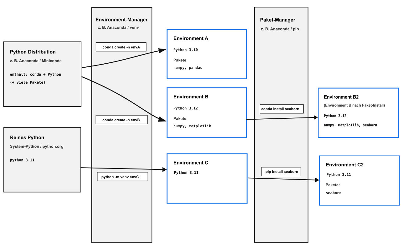 Umgebungen (Environments): getrennte Arbeitsbereiche pro Kurs/Projekt, mit eigener Python-Version und eigenen Paketen.
