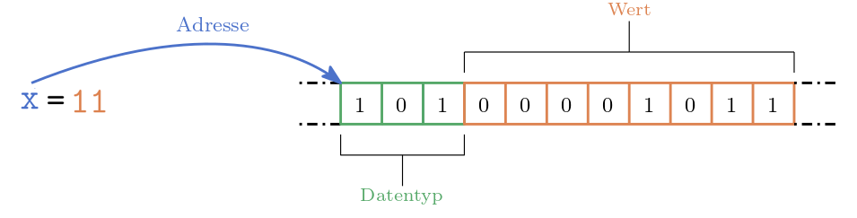 verstanden werden. Die Speicheradresse der Variable zeigt in den Arbeitsspeicher an eine bestimmte Stelle. Dort steht jedoch nicht nur der Wert. Dort steht auch der Datentyp, d. h. die Information, wie dieser Wert zu interpretieren ist.