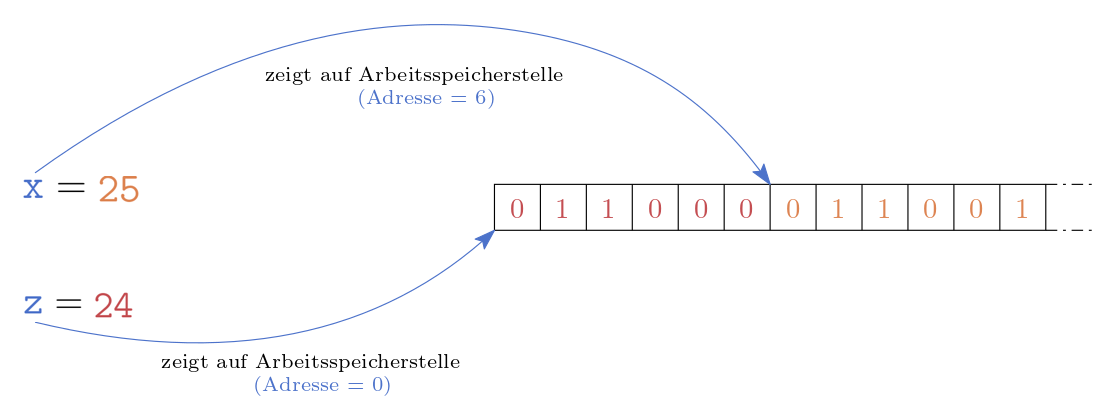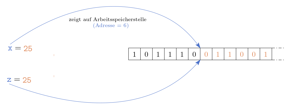 Abb. 6.4 Initialisierung und Zuweisung einer Variablen x und z mit dem Wert 25. Die Adresse beider Variablen ist identisch.#
