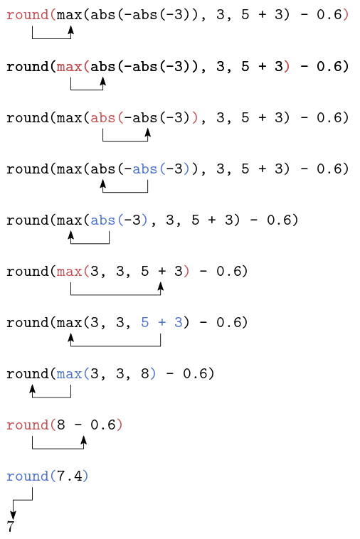 Um round auszuwerten muss zu aller erst der Ausdruck max(abs(-abs(-3)), 3, 5 + 3) - 0.6 ausgewertet werden.