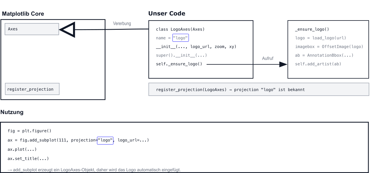class LogoAxes(Axes):und daran, dass zuerst die Elternklasse aufgebaut wird (super().__init__(...)).Registrierung (Architektur/Erweiterungspunkt): Matplotlib muss wissen, dass es diese Variante gibt. Im Code ist das