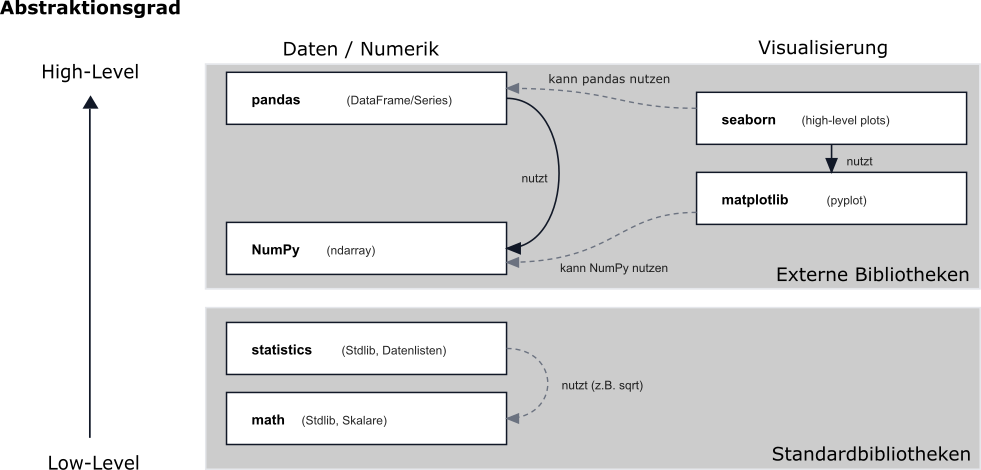 In der Vorlesung und den Praktika sind Ihnen verschiedenen Python-Bibliotheken begegnet, die sich im Abstraktionsgrad und in ihrem Einsatzzweck unterscheiden. Die Grafik soll Sie dabei unterstützen, diese Bibliotheken einzuordnen und ihre Beziehungen zueinander zu verstehen.